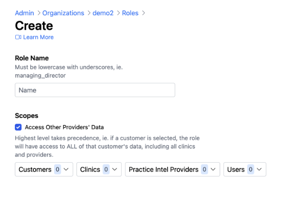 After naming the role, you can optionally select the role scopes. Customers, Clinics, and Prompt Insight Providers only affects Prompt Insight clinical data, where as the User dropdown menu affects Prompt Insight user data (e.g.: usage metrics and admin control). This feature enables you to choose the customers, clinics, and providers that a role can access, but only if the “Access Other Providers’ Data” permission is enabled. Users without the “Access Other Providers’ Data” permission will only be able to access their own data. It is important to note, that if a user has the role of "Superuser", they will be able to see all data, regardless of which scopes have been selected.