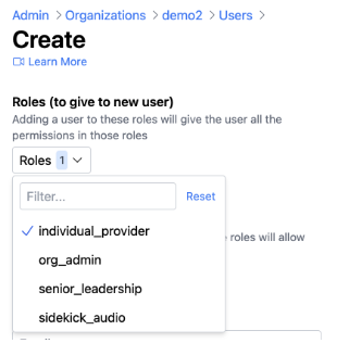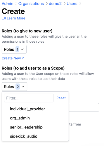 Select which roles you'd like to assign to this user by clicking the "Roles" dropdown menu. You can select multiple roles from this dropdown menu. These roles will determine what permissions your new user will have in the platform and what data they can see.