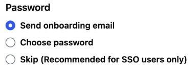 - SSO users’ passwords will be managed by their SSO platform, so for those users you should select the ‘Skip’ option.