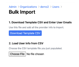 Download the CSV template under item 1. Save this template on your computer. If your EMR data has been processed by Prompt Insight, the template will be populated with the names and IDs of your providers. Open the CSV in Excel or Google Sheets and fill in the email column with the emails that match the provider names in the spreadsheet, and save your changes. Then, back on the bulk import page, click on “Choose File” and upload the CSV file.