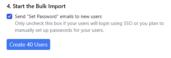 Once you have selected which role to give your users (in step 3 above) you will see an additional menu selection prompting you to create your users. Keep the checkbox next to “Send ‘Set Password’ emails to new users” checked unless you are using a single sign on (SSO) login for your organization or if you plan on manually setting up your users’ passwords yourself.