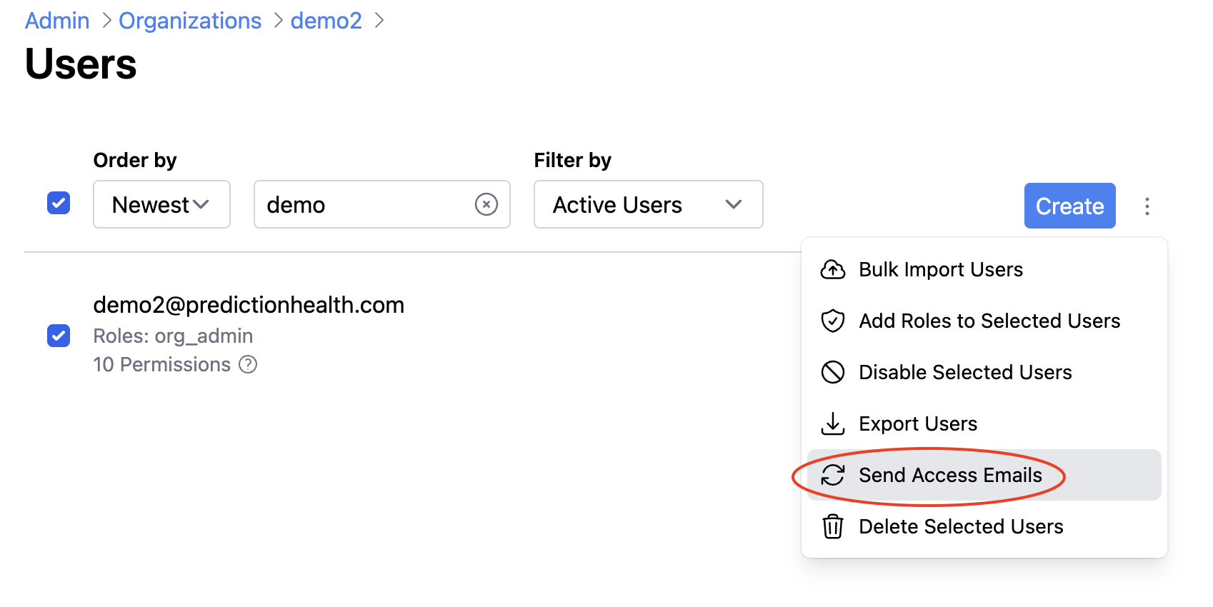 This workflow is recommended for creating 5 or fewer users. To create a single user, click on “Create”: