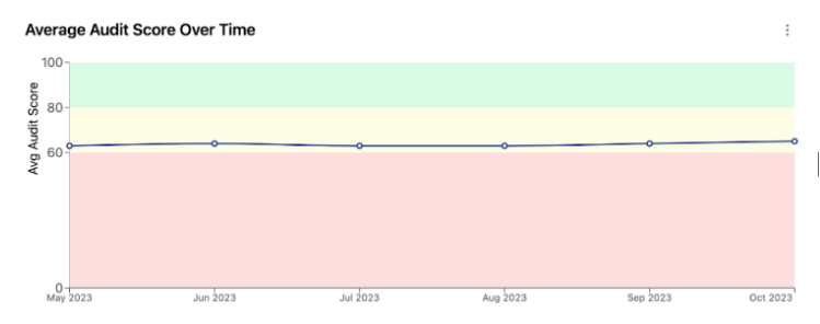 Underneath this is the “Audit Score Over Time” graph. This graph shows a trend line for the clinic’s audit scores and defaults to showing the last six months. Please note, this graph’s date range will update based on the “From” and “To” date range filters you’ve selected.