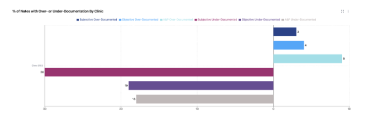 This section of the platform outlines the percentage of notes that are graded as being over or under-documented at a clinic level and at a provider level. Any data that falls to the left of the zero line denotes under-documentation, any data that falls to the right of the zero line indicates over-documentation. Because of this, a “perfect” score on all sections of this graph would show no bars (all bars at zero). We have not identified a target score for this section. Instead, these graphs are designed to help you quickly identify outliers within your organization for both providers who are under and over-documenting.