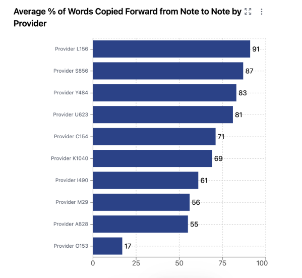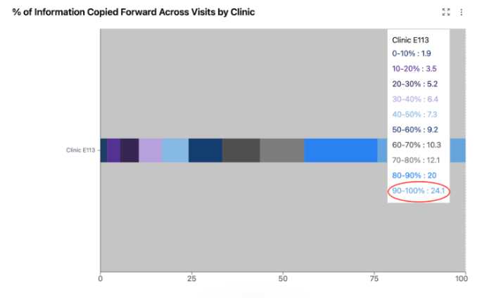 The 90-100% range is important to keep an eye on! In this example we can read this graph as stating: “24.1% of the time 90-100% of all of the text in all of the clinic’s notes within this time frame were copied forward”. From an audit risk perspective, when 90-100% of the note is copied forward it becomes difficult for an auditor to determine whether each individual note has actually been updated for the visit in question (notes in this range of copy forward are at high risk of being flagged as “clones” or exact copies from visit to visit).