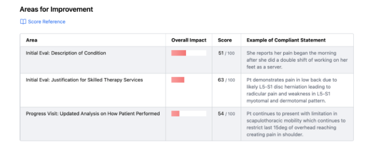 - This table is ranked by overall impact, therefore an item under “Area” may be listed further down the list despite having a lower overall score. In the screenshot above, you can see that the item “Progress Visit: Updated Analysis on How Patient Performed” is ranked 3rd despite having the second lowest score on the list. This is because the two preceding items carry significantly more weight in the audit score and are recommended to be addressed first.