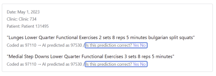 Suppose a therapist documents the intervention "Rows RTB 2x15" and assigns the CPT code for Therapeutic Exercise (97110). Our model may suggest that this could alternatively have been coded as Neuromuscular Re-education (97112). The rationale for this suggestion is that rows are commonly used to aid with posture, and any posture-related exercise could potentially be coded under Neuromuscular Re-education. While this intervention may require more justification to be coded as Neuromuscular Re-education, we want our users to be aware of such possibilities. This way, therapists can understand which specific activities performed could be coded differently