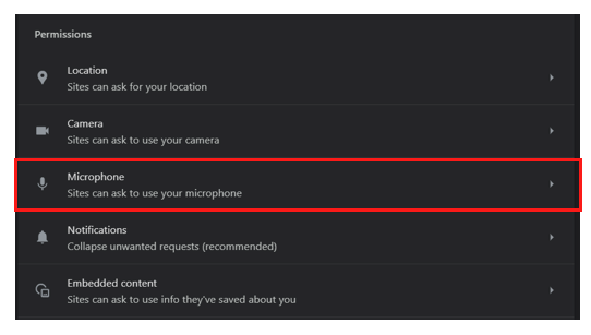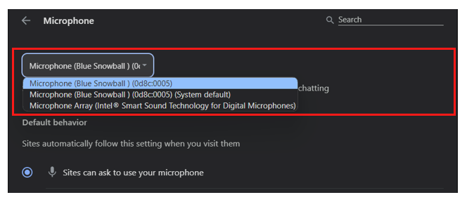 - Select which Microphone you would like to be the default for Chrome and also ensure that the setting for “sites can ask to use your microphone” is enabled: