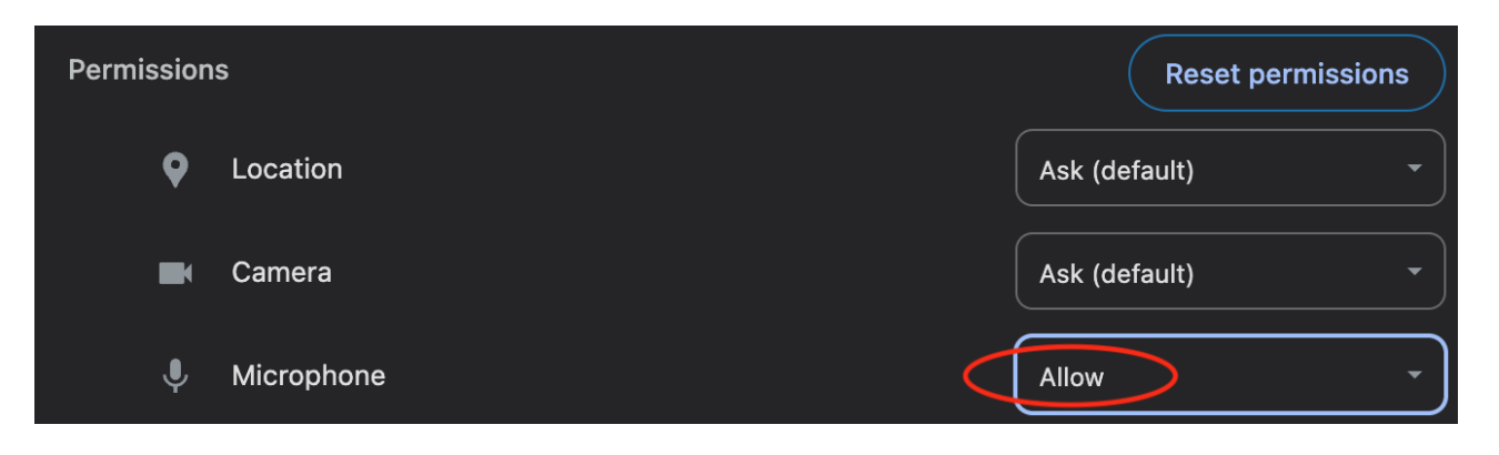 - Ensure that the dropdown next to “microphone” is set to “Allow”