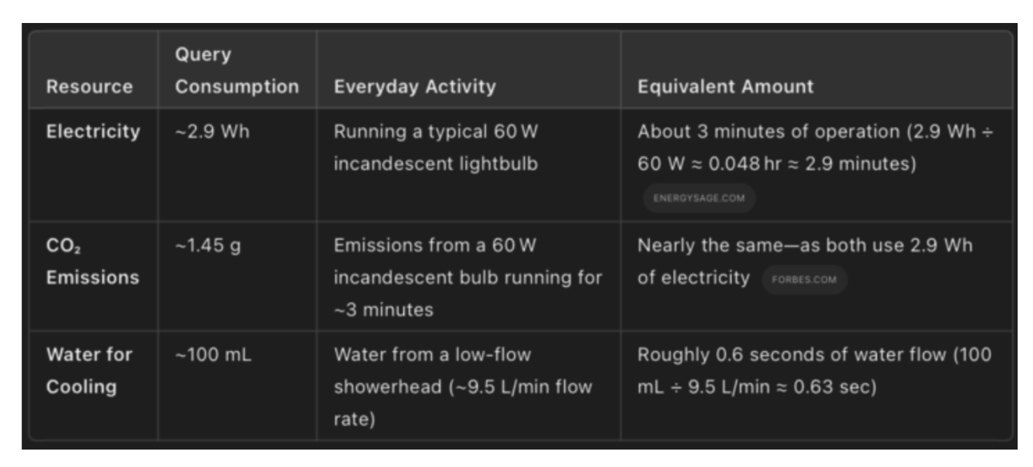 - Each ChatGPT query / action uses about 2.9 Wh of electricity (costing ~0.04 cents), emits roughly 1.45 g of CO₂, and uses on average about 100 mL of water for cooling. (There's a cool graph attached to this that compares it to things we're familiar with / every day things)