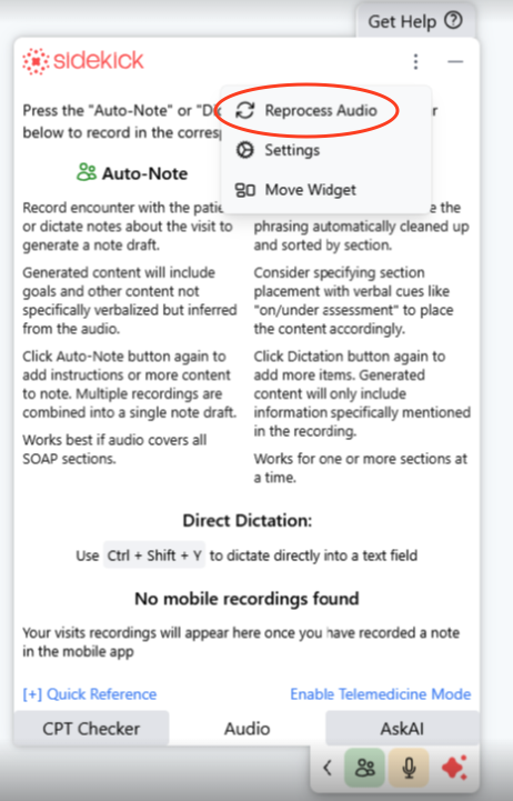 If you are using Prompt as your EMR, you will be logged into Native Sidekick automatically. For security reasons the Sidekick extension will typically log a user out after a week’s time. It’s good practice to open the extension at the start of the day to ensure that you are logged in and ready to go when your first patient walks in the door. Pro tip: in a similar vein, your computer’s performance can be affected if you do not occasionally shut it down. We recommend restarting your computer on a weekly basis to optimize performance.