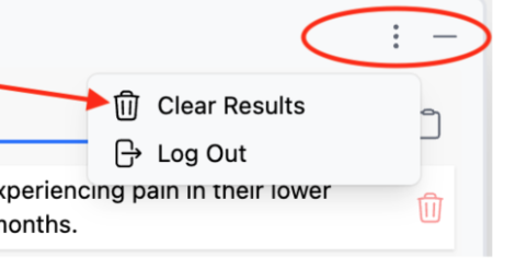 Yes, it is possible to clear your audio dictation results. Please keep in mind that if you clear your results they will not be available to you again for use in the future, this is effectively starting the note over from scratch! To do this, once your audio results have populated, click on the ellipse in the upper right hand corner of the chatbot and then click on “Clear Results”. We recommend using this option sparingly.