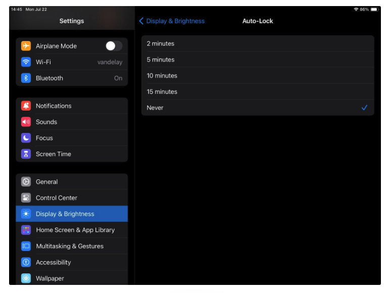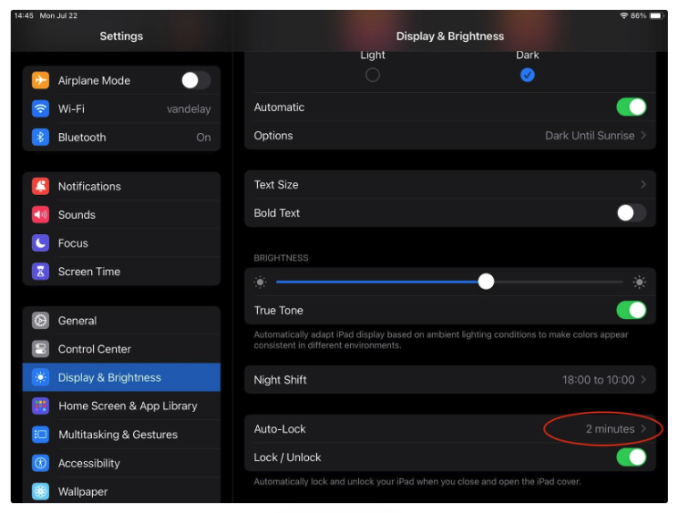 Return to your main Settings page, navigate to “Display & Brightness” in the left hand menu, scroll down to “Auto-Lock”, and select an appropriate duration.