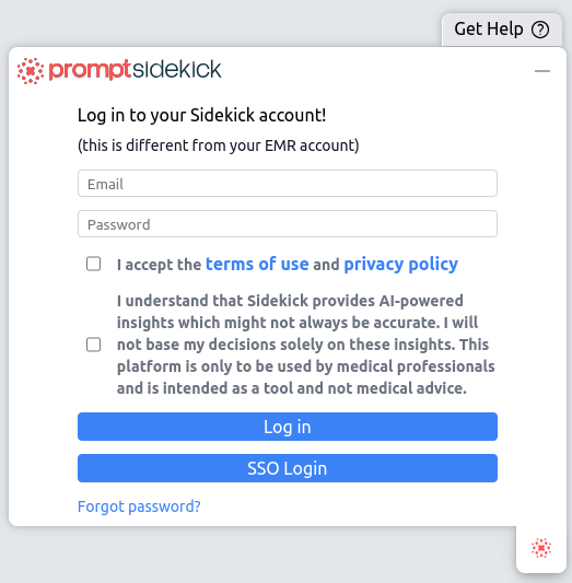 Navigate to your EMR website and login with your EMR credentials. Once you have logged into your EMR, you will see the Sidekick icon appear in the lower right corner of the page: